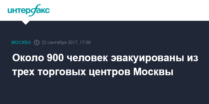 Москва. 22 сентября. INTERFAX.RU - Три столичных торговых центра эвакуируют после поступления анонимного звонка об угрозе взрыва, сообщил "Интерфаксу" осведомленный источник.