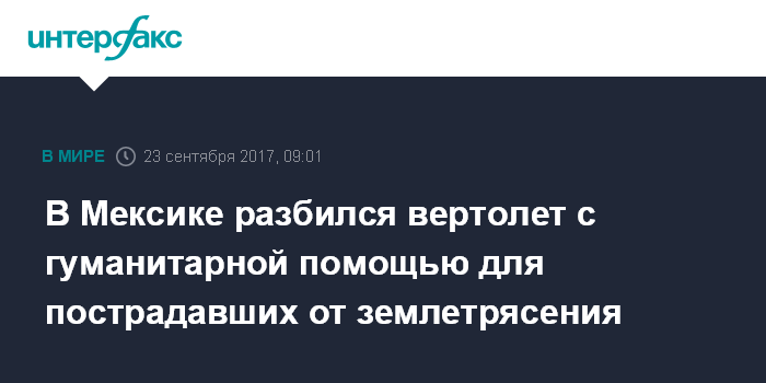 Москва. 23 сентября. INTERFAX.RU - В Мексике разбился вертолет, доставлявший гуманитарную помощь в районы, пострадавшие в результате землетрясения, один человек погиб, сообщает в субботу агентство Associated Press.