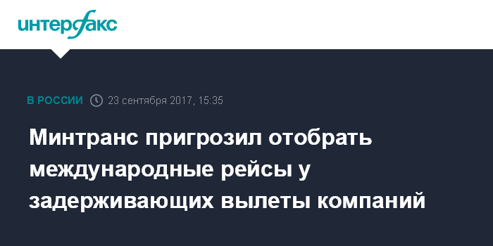 Москва. 23 сентября. INTERFAX.RU - Минтранс РФ может ввести практику отзыва разрешения на выполнение международных рейсов у авиакомпаний, которые допускают массовые задержки вылетов.