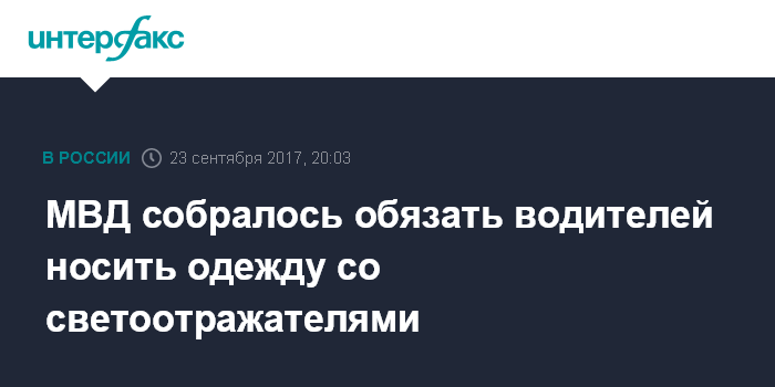 Москва. 23 сентября. INTERFAX.RU - МВД РФ намерено обязать водителей носить светоотражающую одежду при ночных остановках за пределами населенных пунктов, говорится на сайте ведомства.