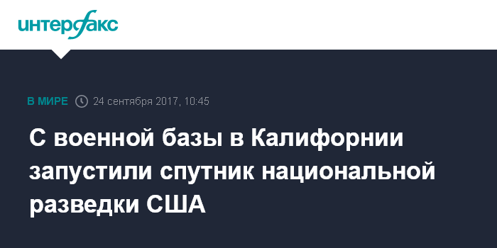 Москва. 24 сентября. INTERFAX.RU - Спутник, принадлежащий Управлению национальной разведки США, запущен в ночь на воскресенье с военно-воздушной базы "Ванденберг" в штате Калифорния, сообщает агентство Associated Press.