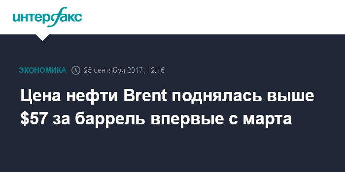 Москва. 25 сентября. INTERFAX.RU - Стоимость нефти Brent на торгах в Лондоне в понедельник поднялась выше $57 за баррель - внутридневное повышение цены до этого уровня отмечено впервые с марта 2017 года.
