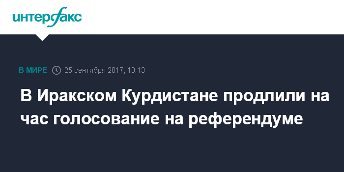 Москва. 25 сентября. INTERFAX.RU - Власти Иракского Курдистана решили продлить голосование о независимости этого автономного региона от Ирака на один час, сообщает "Рудау".