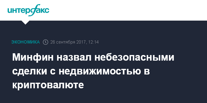 Москва. 26 сентября. INTERFAX.RU - Сделки с недвижимостью с привлечением криптовалюты не могут быть безопасными, заявил журналистам во вторник замглавы Минфина Алексей Моисеев.