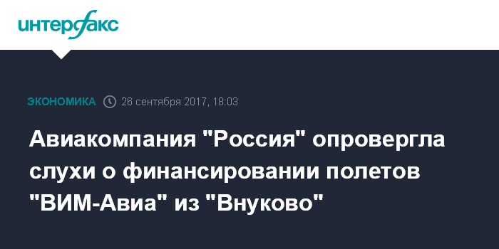 Москва. 26 сентября. INTERFAX.RU - Авиакомпания "Россия" официально опровергла информацию о том, что она будет финансировать полеты "ВИМ-Авиа" из "Внуково".