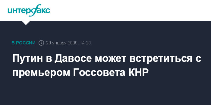 Пекин. 20 января. INTERFAX.Ru - Премьер-министр России Владимир Путин встретится с премьером Госсовета КНР Вэнь Цзябао на Всемирном экономическом форуме в Давосе, сообщил вице-премьер - министр финансов РФ Алексей Кудрин журналистам в Пекине во вторник.