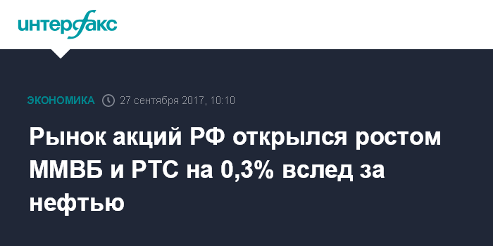 Москва. 27 сентября. INTERFAX.RU - Рынок акций РФ открылся в среду ростом цен blue chips и индексов на фоне отскока нефти вверх, индексы ММВБ и РТС за минуту торгов прибавили по 0,3%.