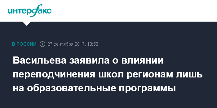 Москва. 27 сентября. INTERFAX.RU - Инициатива о передаче школ, в подавляющем большинстве являющихся муниципальными, в региональное подчинение касается образования, а не имущества, заявила министр образования и науки РФ Ольга Васильева.