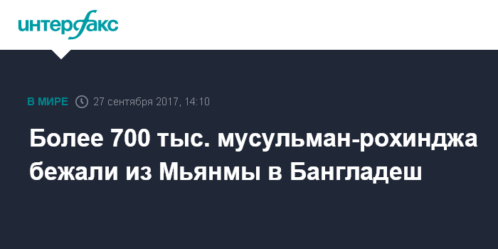 Москва. 27 сентября. INTERFAX.RU - Из Мьянмы в Бангладеш бежало от 700 тысяч до 800 тысяч представителей мусульманской народности рохинджа, сообщил в среду верховный комиссар ООН по делам беженцев Филиппо Гранди.