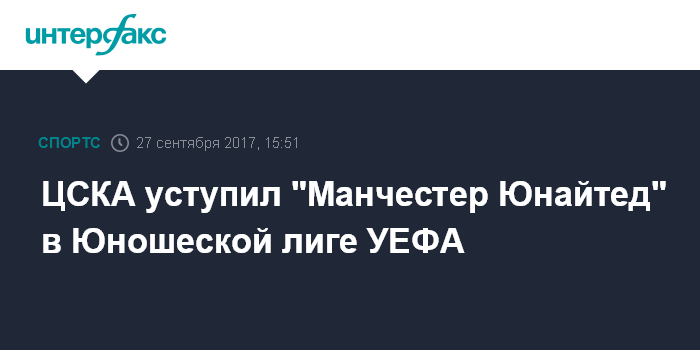 Москва. 27 сентября. INTERFAX.RU - Футболисты юношеской команды ЦСКА потерпели поражение от сверстников из английского клуба "Манчестер Юнайтед" в матче второго тура группового этапа Юношеской лиги УЕФА.