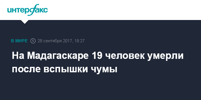 Москва. 28 сентября. INTERFAX.RU - За последние два месяца жертвами вспышки чумы на Мадагаскаре стали 19 человек, сообщают в четверг западные СМИ.