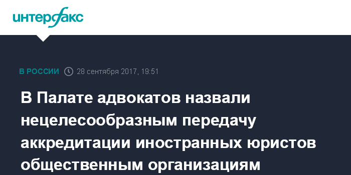 Москва. 28 сентября. INTERFAX.RU - Исполнительный вице-президент Федеральной палаты адвокатов (ФПА РФ) Андрей Сучков считает, что аккредитацией иностранных юристов должен заниматься Минюст, передавать эту процедуру общественным организациям нецелесообразно.
