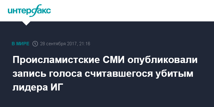 Москва. 28 сентября. INTERFAX.RU - Связанное с террористической группировкой "Исламское государство" (запрещена в РФ) СМИ опубликовало аудиозапись с голосом, предположительно, лидера ИГ Абу Бакра аль-Багдади, который считается уничтоженным, сообщает в четверг агентство АР.