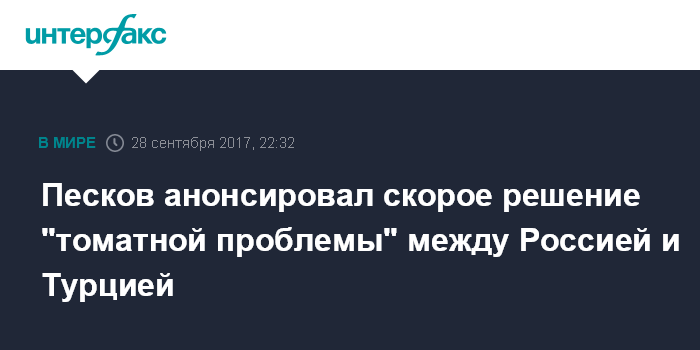 Москва. 28 сентября. INTERFAX.RU - Россия и Турция близки к разрешению "томатного вопроса", сказал пресс-секретарь президента РФ Дмитрий Песков журналистам в четверг.