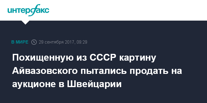Москва. 29 сентября. INTERFAX.RU - Украденную еще из СССР картину Ивана Айвазовского сняли с торгов в Швейцарии, сообщила "Интерфаксу" в пятницу официальный представитель МВД РФ Ирина Волк.