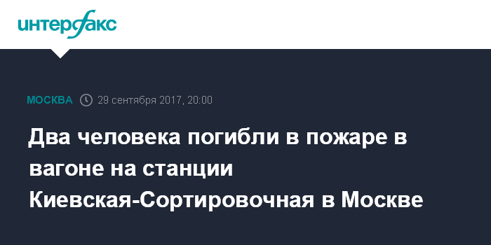 Москва. 29 сентября. INTERFAX.RU - В Москве два человека погибли в результате пожара в вагоне, стоящем на путях в районе Киевского вокзала, сообщил "Интерфаксу" в пятницу информированный источник.