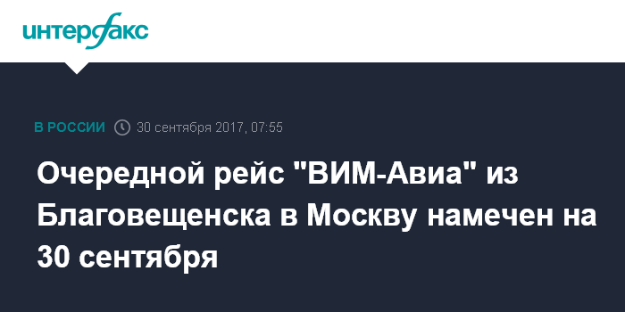 Очередной рейс "ВИМ-Авиа" из Благовещенска в Москву намечен на 30 сентября
