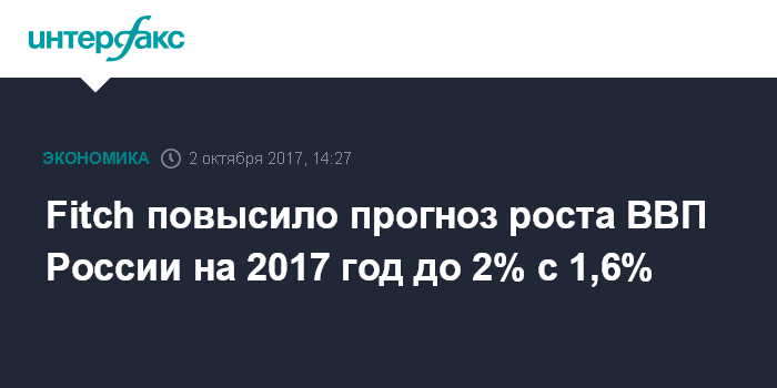 Москва. 2 октября. INTERFAX.RU - Международное рейтинговое агентство Fitch повысило прогноз роста ВВП России на 2017 год до 2% с 1,6%, ожидавшихся в июне.