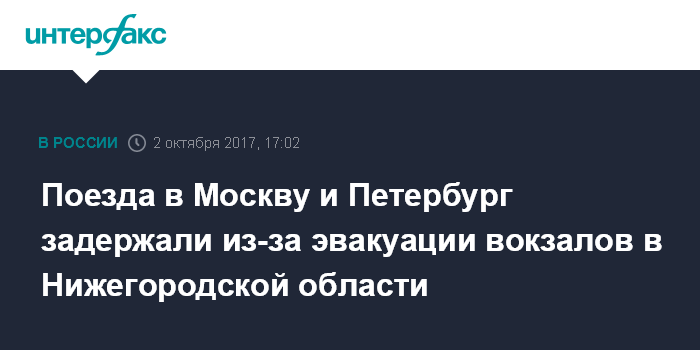 Москва. 2 октября. INTERFAX.RU - Четыре поезда дальнего следования и две электрички были задержаны на Горьковской железной дороге (ГЖД, филиал ОАО "РЖД") из-за эвакуации вокзалов в Нижегородской области после сообщений о бомбах.