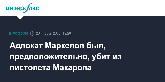 Москва. 20 января. INTERFAX.RU - Адвокат Станислав Маркелов был застрелен, вероятно, из пистолета Макарова, сообщил "Интерфаксу" источник в оперативно-следственной группе.