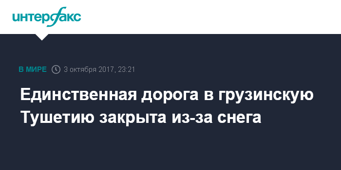 Москва. 3 октября. INTERFAX.RU - Единственная автомобильная дорога в Тушетию (историческая горная область на северо-востоке Грузии), которая своей уникальной природой особенно привлекает туристов, закрылась из-за интенсивного снегопада, сообщают грузинские СМИ во вторник вечером.