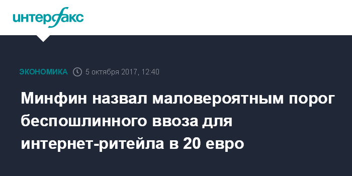 "Вопрос о 20 евро не решен. Те обсуждения, которые есть про 20 евро, это слишком радикальная мера. Чтобы это сделать одномоментно, нужно существенно модифицировать инфраструктуру. Ставка налога при превышении порога (беспошлинного ввоза - ИФ) - 30%. Ставка НДС - 18%. С точки зрения экономической логики, ставка 30% при превышении порога 20 евро не может быть при ставке НДС 18%. Поэтому с высокой долей вероятности порог до 20 евро опущен сам по себе быть не может, потому что тогда (. . .) в неравном конкурентном преимуществе окажутся российские продавцы, потому что при покупке в России вы платите НДС 18%, а здесь при превышении 20 евро будете платить 30%. Поэтому мое личное мнение, что порог до 20 евро опущен быть не может в силу того, что ставка 30% - несправедлива. Мое глубокое убеждение, что взять и опустить (порог - ИФ) до 20 евро просто невозможно", - сказал он журналистам.