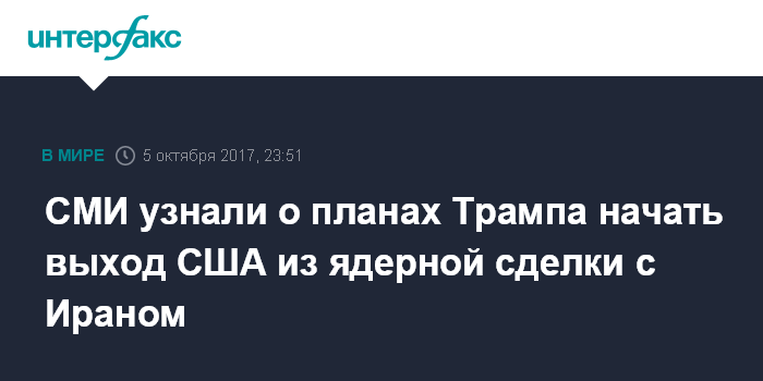 Москва. 5 октября. INTERFAX.RU - Президент США Дональд Трамп намеревается на следующей неделе сделать заявление о том, что соглашение по ядерной программе Тегерана противоречит интересам США, и таким образом, начать процесс выхода из соглашения, сообщает в четверг газета The Washington Post.