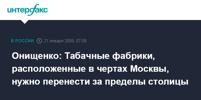 Москва. 21 января. ИНТЕРФАКС - Работающие на территории Москвы табачные фабрики должны быть перенесены за пределы города, считает глава Роспотребнадзора, главный государственный санитарный врач РФ Геннадий Онищенко.