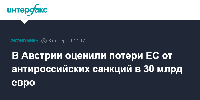 Москва. 6 октября. INTERFAX.RU - Антироссийские санкции с 2014 по 2016 год обошлись государствам Евросоюза в 30 млрд евро потерянного экспорта, говорится в докладе австрийского института экономических исследований (WIFO).