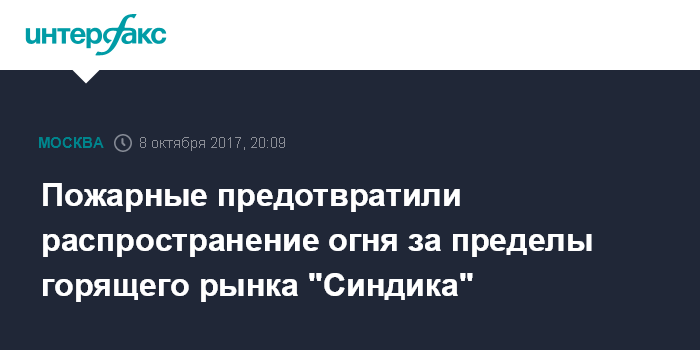 Москва. 8 октября. INTERFAX.RU - Пожарным удалось рассечь на отдельные очаги возгорание на строительном рынке "Синдика" в Одинцовском районе Подмосковья, сообщили "Интерфаксу" в региональном главке МЧС вечером в воскресенье.