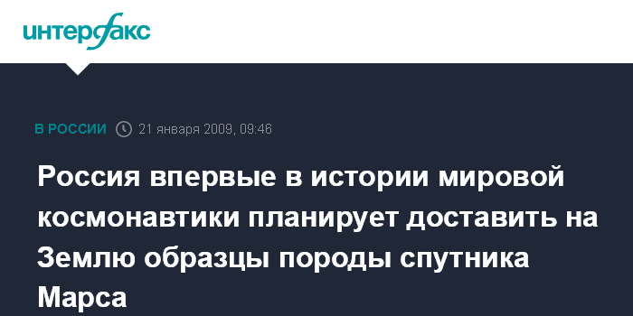 Москва. 21 января. INTERFAX.RU - Глава Роскосмоса Анатолий Перминов сообщил, что Россия в 2009 году отправит к Марсу космический аппарат для того, чтобы доставить на Землю породы со спутника Марса.