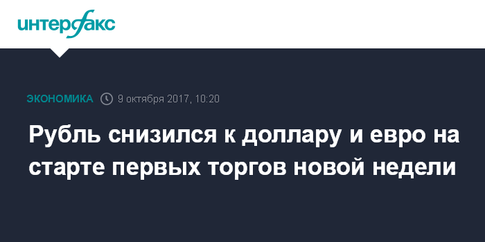 Как отмечают эксперты "Интерфакс-ЦЭА", рубль снижается к доллару и евро на старте торгов понедельника, продолжая отыгрывать существенное падение цен на нефть в пятницу и по итогам минувшей недели. В понедельник котировки "черного золота" лишь слегка повышаются, в то время как в целом за прошедшую неделю Brent подешевела на 3,3%, WTI - на 4,6%.