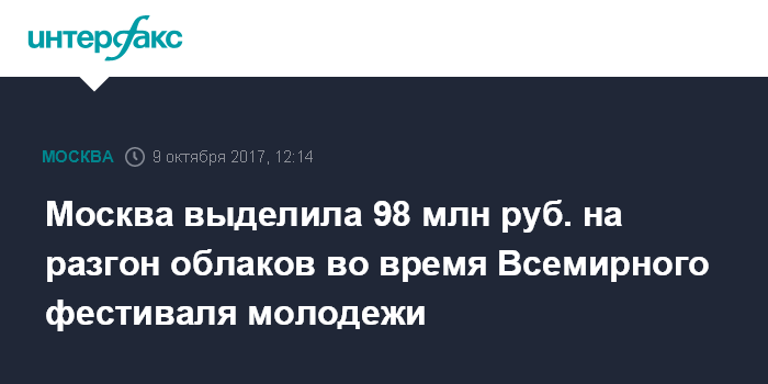 Москва выделила 98 млн руб. на разгон облаков во время Всемирного фестиваля молодежи