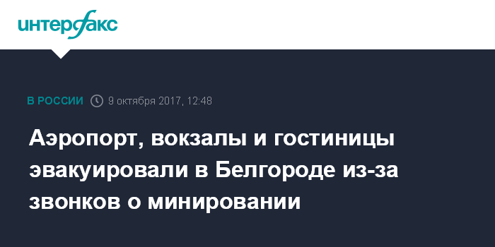 Москва. 9 октября. INTERFAX.RU - В Балгороде неизвестные сообщили о минировании нескольких гостиниц, вокзалов и аэропорта, передают местные СМИ.