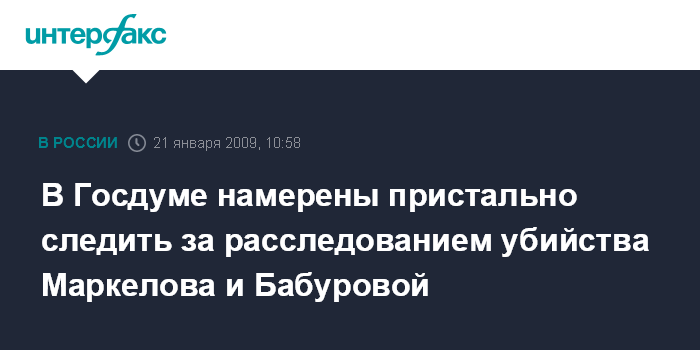 Москва. 21 января. INTERFAX.RU - Депутаты Государственной думы РФ рассчитывают, что правоохранительные органы будут информировать их о ходе расследования уголовного дела, возбужденного по факту убийства адвоката Станислава Маркелова и журналистки Анастасии Бабуровой.