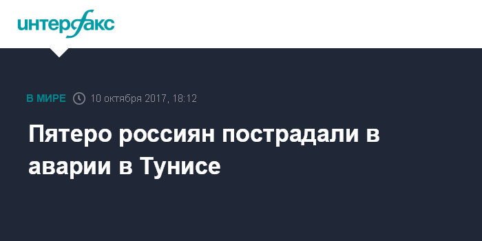 Москва. 10 октября. INTERFAX.RU - Пятеро российских туристов пострадали в результате дорожно-транспортного происшествия в Тунисе, передает местное радио Mosaicfm.