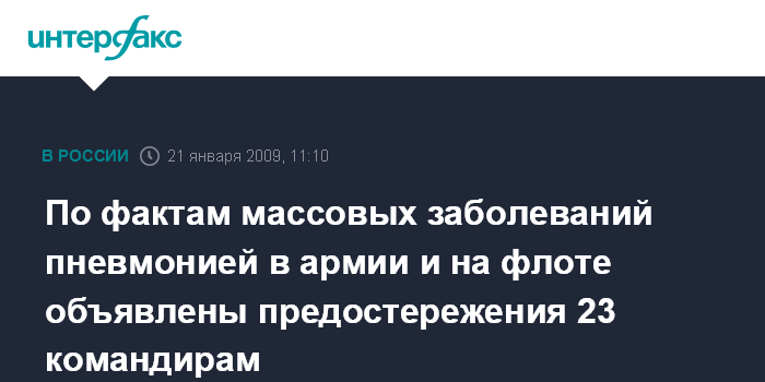 Москва. 21 января. INTERFAX.RU - Двум десяткам командиров и начальников Балтийского флота и Приволжско-Уральского военного округа объявлены предостережения, связанные с заболеванием пневмонией солдат-срочников в воинских частях, заявил начальник управления Главной военной прокуратуры генерал-майор юстиции Александр Никитин.