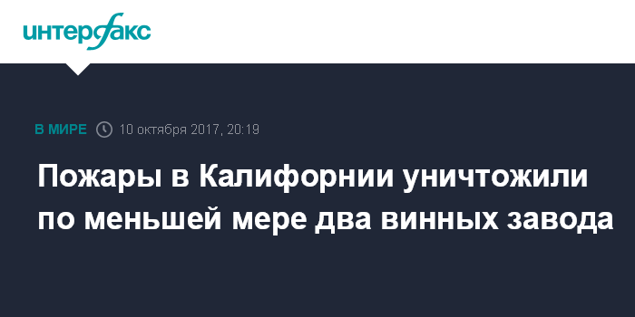 Москва. 10 октября. INTERFAX.RU - Лесные пожары, бушующие на севере американского штата Калифорнии, уничтожили два винных завода Signorello Estate в округе Напа и Paradise Ridge в округе Сонома, сообщает во вторник агентство Associated Press.