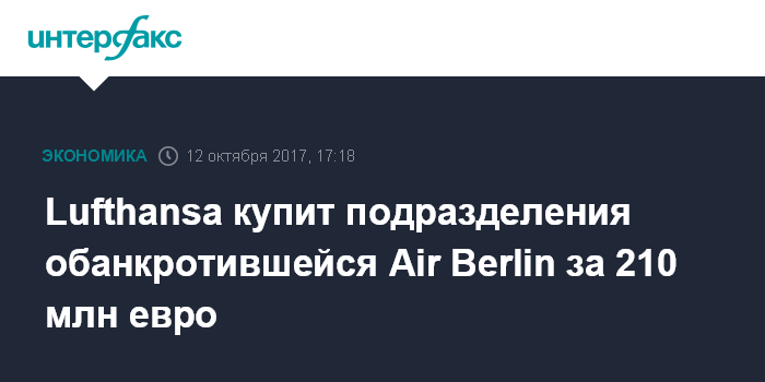 Ранее в четверг гендиректор Lufthansa Карстен Шпор в интервью газете Rheinische Post заявлял, что его авиакомпания подпишет 12 октября договор о приобретении значительной части активов обанкротившегося германского авиаперевозчика Air Berlin.