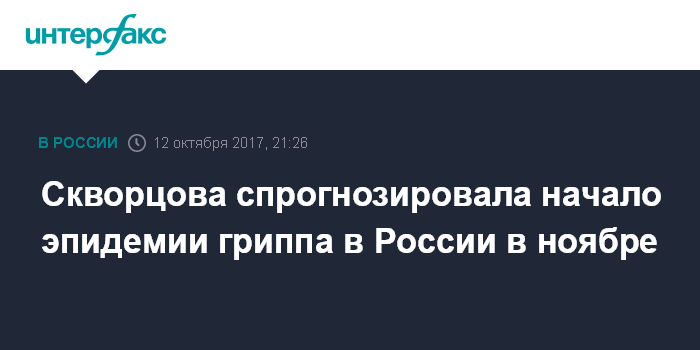 Москва. 12 октября. INTERFAX.RU - Эпидемический порог по гриппу в России пока не превышен, эпидемия придет в ноябре, сообщила министр здравоохранения Вероника Скворцова.
