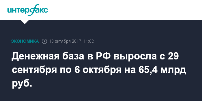 Денежная база в РФ выросла с 29 сентября по 6 октября на 65,4 млрд руб.