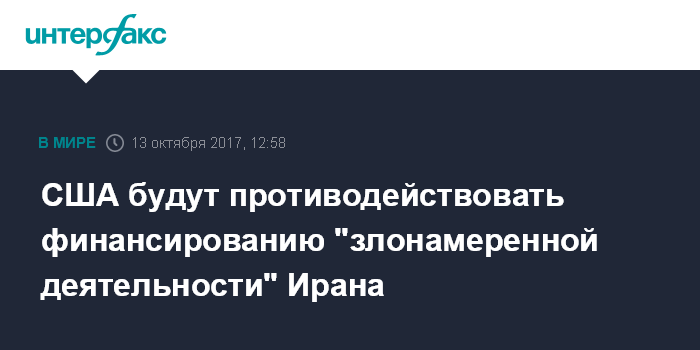 Москва. 13 октября. INTERFAX.RU - Вашингтон будет работать над тем, чтобы не допустить финансирования "злонамеренной деятельности" иранского режима, в особенности деятельности Корпуса Стражей Исламской революции (КСИР).
