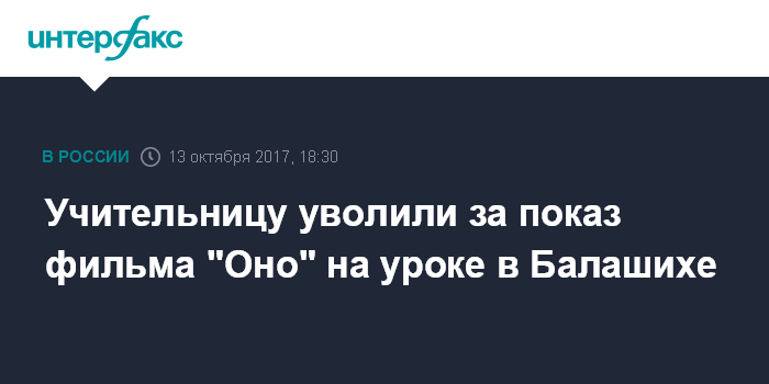 Москва. 13 октября. INTERFAX.RU - Учительницу одной из школ подмосковной Балашихи уволили после того, как на уроке она показала детям фильм "Оно" по книге Стивена Кинга, сообщили "Интерфаксу" в пресс-службе администрации городского округа.