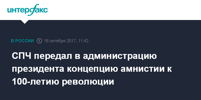 "Мы передали в администрацию наши предложения по концепции амнистии к столетию русской революции. Речь идет не об Октябрьской революции, а именно о революции 1917 года, которая началась в феврале 1917 года и закончилась в начале 1918 года разгоном Учредительного собрания", - сказал председатель СПЧ Михаил Федотов журналистам в понедельник.