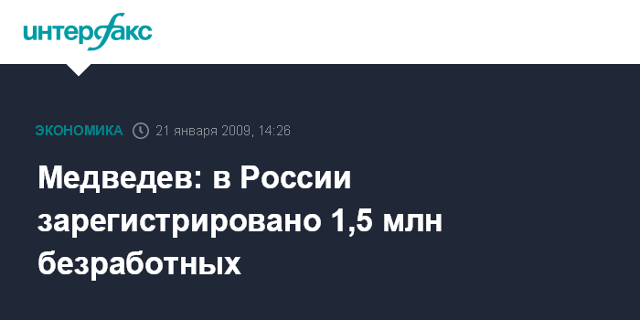 Горки. 21 января. INTERFAX.RU - Безработица в России, по сравнению с октябрем, выросла на 20% и составляет 1,5 млн человек, сообщил президент России Дмитрий Медведев на совещании с полпредами в федеральных округах. Мероприятие посвящено ситуации, которая сложилась на рынке труда.