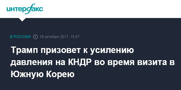 Москва. 16 октября. INTERFAX.RU - Президент США Дональд Трамп намерен в ходе своего визита в Южную Корею, который состоится 7 ноября, призвать международное сообщество к усилению давления на КНДР, сообщили в понедельник в Белом доме.