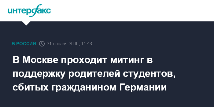 Москва. 21 января. INTERFAX.RU - На юго-западе столицы у здания немецкого посольства в среду днем проходит митинг в защиту родителей двух студентов, которых сбила машина под управлением гражданина Германии, передает корреспондент "Интерфакса".