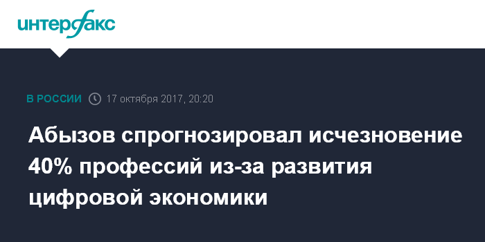 Москва. 17 октября. INTERFAX.RU - Министр по вопросам Открытого правительства Михаил Абызов заявил, что около 30-40% профессий в будущем исчезнет из-за развития цифровой экономики.