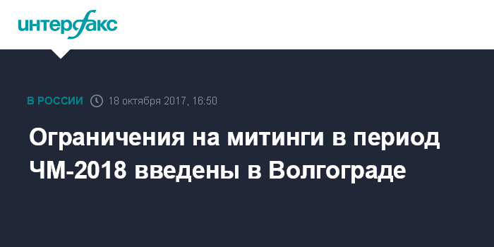 Москва. 18 октября. INTERFAX.RU - Ограничение на проведение собраний, митингов, демонстраций, шествий и пикетирований введено в Волгограде на период проведения ЧМ-2018.
