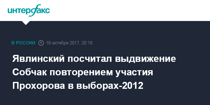 Москва. 18 октября. INTERFAX.RU - Председатель федерального политкомитета "Яблока" Григорий Явлинский сравнил заявление телеведущей Ксении Собчак о намерении участвовать в выборах президента РФ с выдвижением бизнесмена Михаила Прохорова на пост главы государства в 2012 году.
